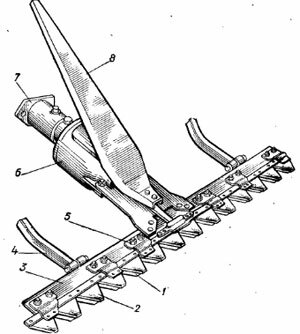 27. Косилка КФН-1: I, 2 — нижний н верхний ножн; 3 — брус; 4 — опорный полозок-, 5 — прижимы; 6 — механизм привода режущего аппарата; 7 — узел крепления косилки к мотоблоку; 8 — делитель