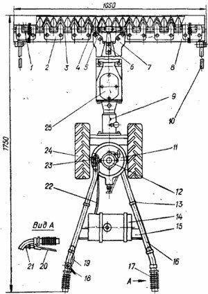 29. Косилка моторизованная пешеходная К ММ-1,0: 1 — защитный кожух; 2 — прижим; 3 — спинка ножа; 4, 5 — сегменты; 6 — первый рычаг; 7 — кронштейн; 8 — брус; 9 — фланец фиксирующий; 10 — полозок; 11 — двигатель; 12 — стар-тер; 13 — хомутик; 14-топливный бак; 15 — переключатель; 16 — рукоятка; 17 — ручка руля; 18 — рычаг управления подачей воздуха (газа); 19 — трос воздушного карбюратора и дросселя; 20-рычаг управления сцеплением; 21 — трос сцепления; 22 — бензопровод; 23 — резиновая втулка; 24 — ходовое колесо; 25 — приводная коробка