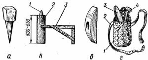 31. Инструмент для отбивки косы и правки ее в поле: а — широкая наковальня (бабка); б — приспособление для отбивки ножа косы: 1 — узкая бабка; 2 — колода; 3 — лавочка; в — молоток с узким бойком; г — лопатник; 1 — берестяный футлярчик; 2 — поясной ремень; 3 — брусок; 4 — гладкий стальной стержень