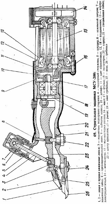 Стригальная машинка МСО-77Б (рис. 68) состоит из алюминиевого корпуса, шарнирного, эксцентрикового нажимного механизмов и режущей пары. Шарнирный механизм состоит из передаточного вала 18, наружного кожуха 17, шестерен 20 и 23, внутреннего кожуха 24 и предназначен для передачи вращения под различным углом от гибкого вала к машинке. В эксцентриковом механизме вращательное движение эксцентрикового вала 26 с роликом 12 преобразуется в колебательное движение рычага 28 и от него передается ножу. Нажимной механизм позволяет регулировать нажатие ножа на гребенку и обеспечивает равномерность этого нажатия. Стригальщик нажимает на гайку 7, которая навернута на верхнюю часть штуцера 5 и фиксируется кольцом 9. Режущая пара состоит из гребенки и размещенного над ней ножа. Ширина захвата режущей пары 76,8 мм, высота среза шерсти 3-5 мм. Гребенка расчесывает шерсть на пучки, и ножи срезают шерстяные волокна. Частота колебаний ножа 2300 двойных ходов за минуту, масса машинки 1,13 кг.